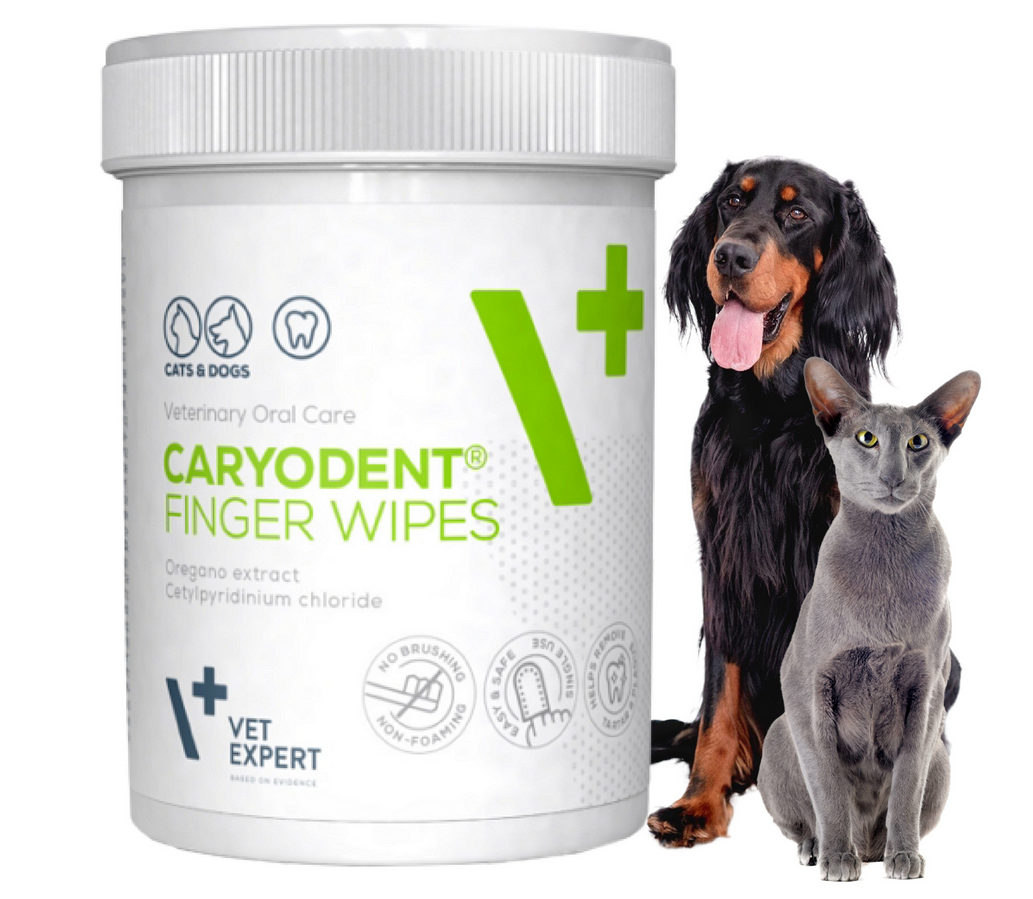Caryodent Finger Wipes to jednorazowe nakładki na palec, które służą do czyszczenia zębów i dziąseł psów i kotów. Za ich pomocą łatwo zadbasz o zdrowie jamy ustnej swojego pupila