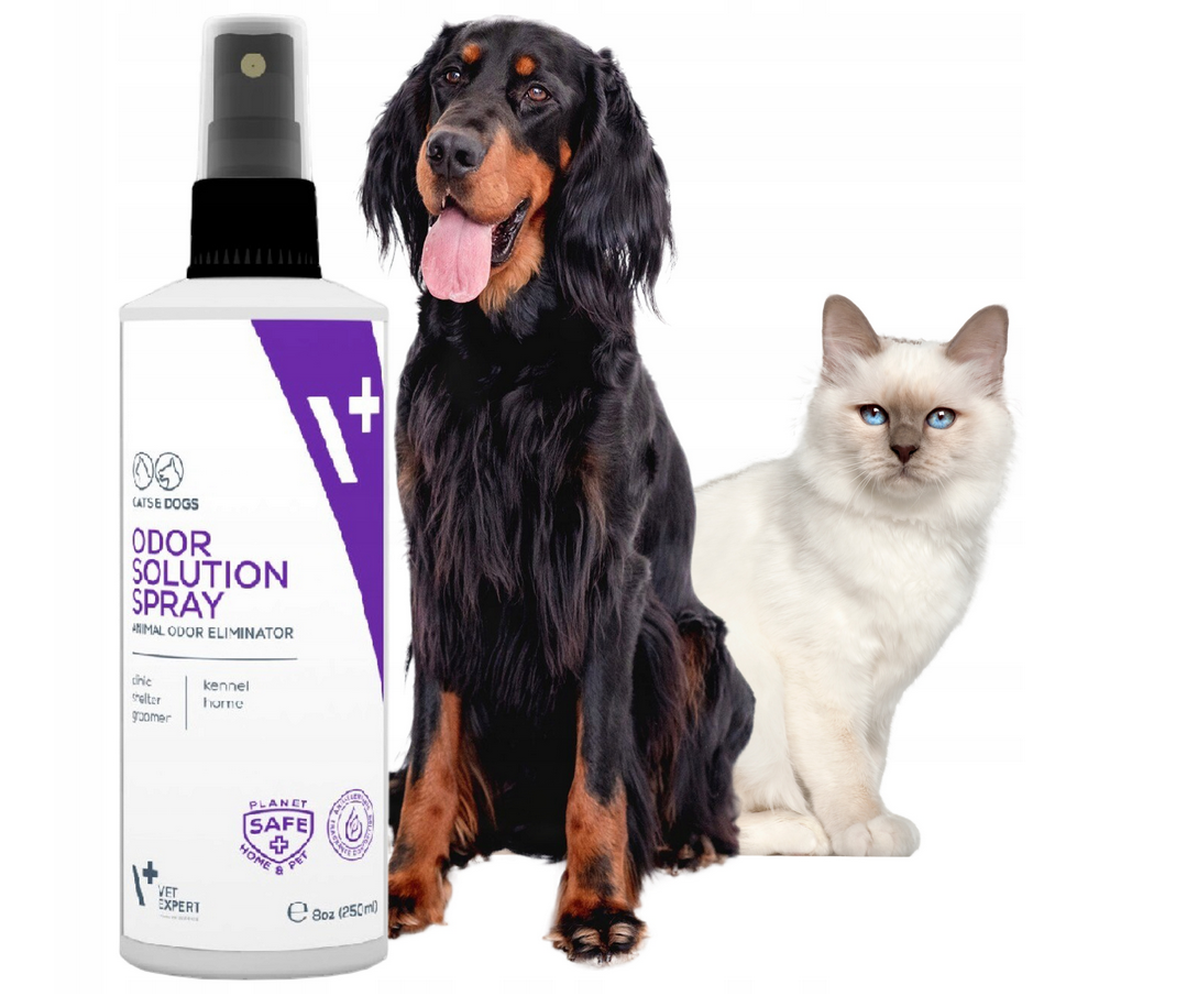 VET EXPERT ODOR SPRAY SOLUTION to preparat, który eliminuje nieprzyjemny zapach zwierząt. Nie tylko neutralizuje odory, ale także zapobiega rozwojowi nowych. Ze względu na wszechstronność sprawdzi się nie tylko w domu, ale także w salonach pielęgnacyjnych, hodowlach oraz schroniskach